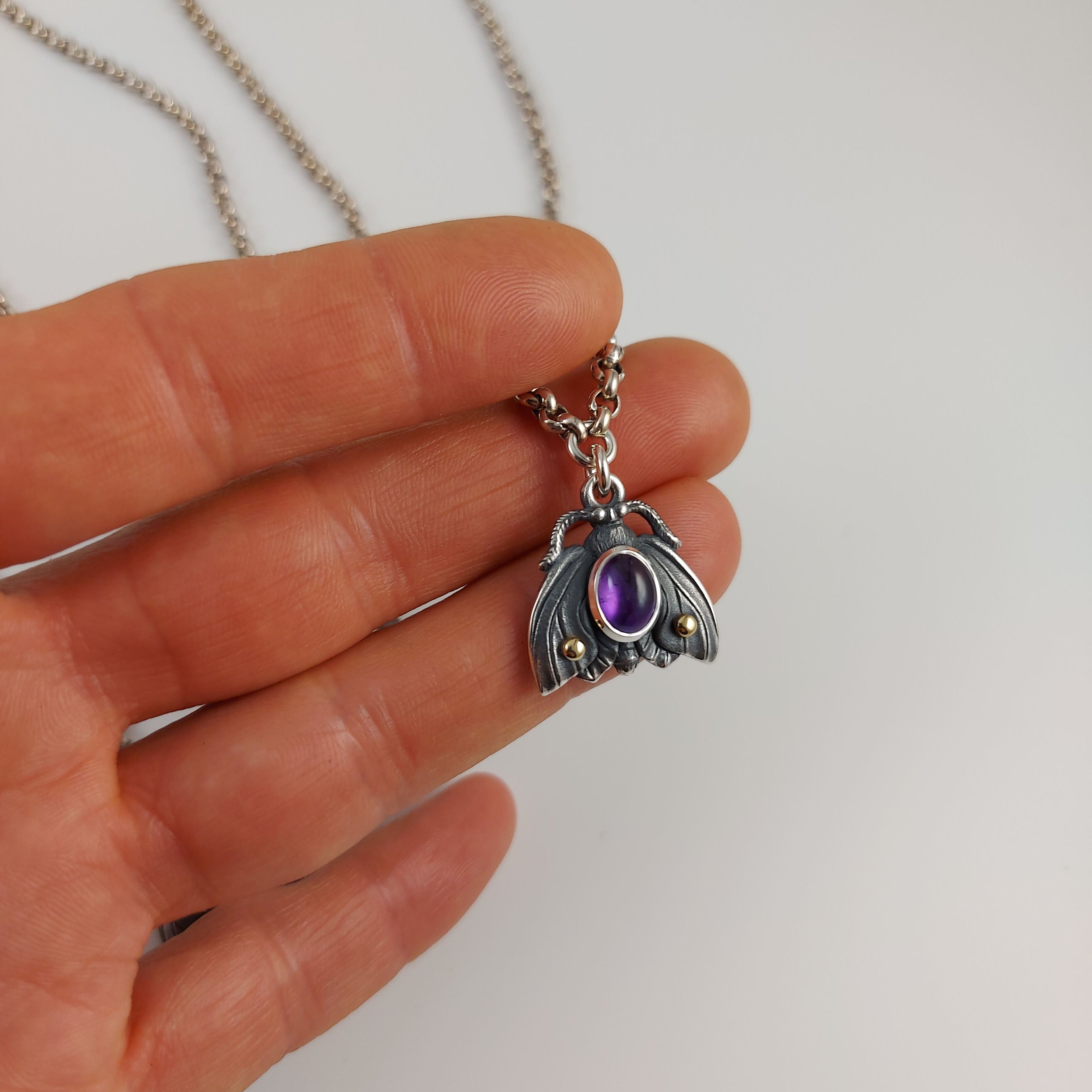 The Moth Pendant is lovingly hand crafted in Sterling Silver with 18ct Yellow Gold highlights on the wings.