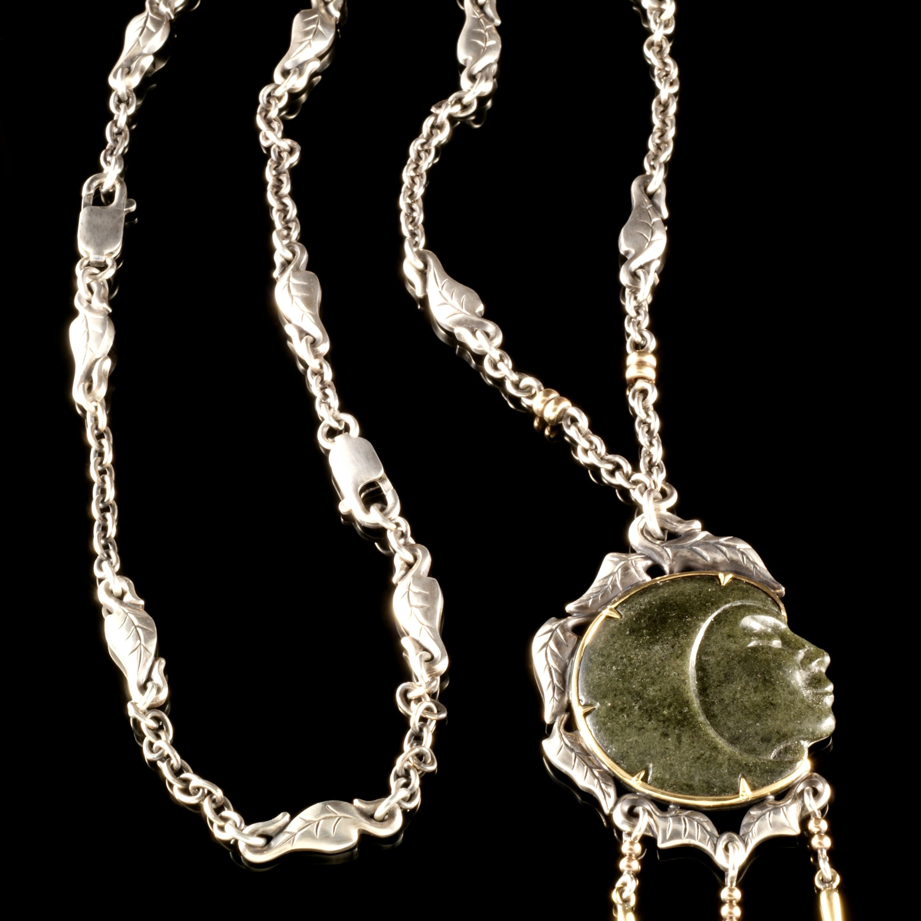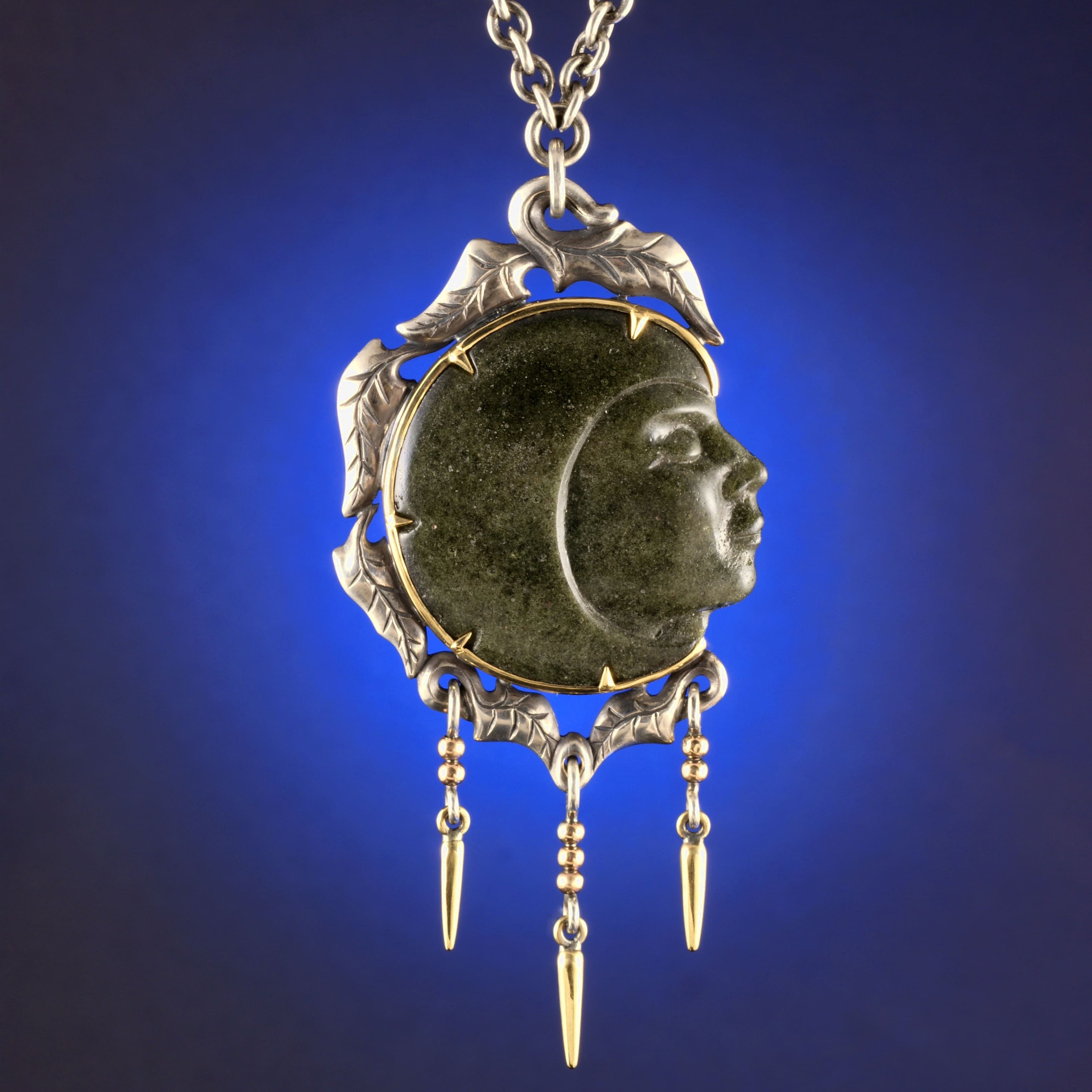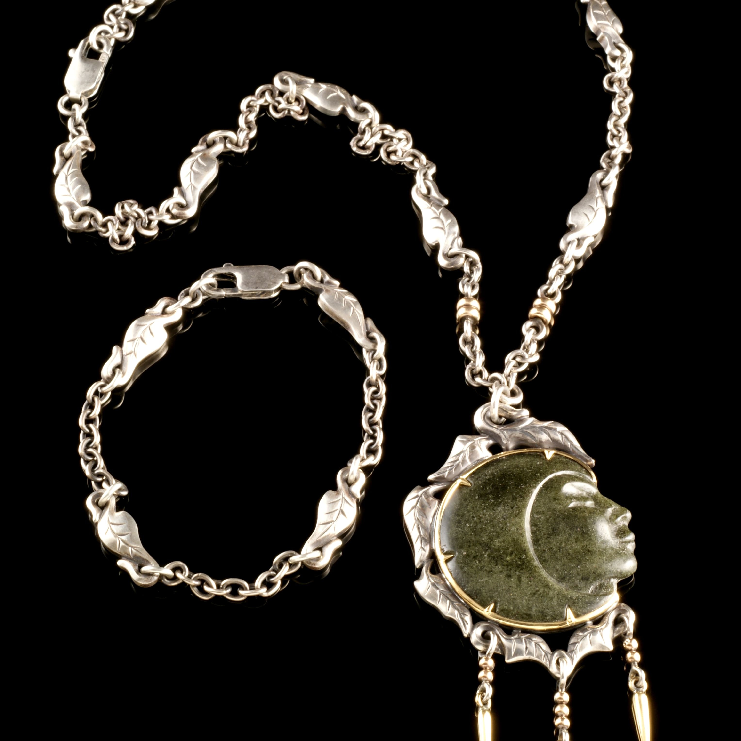 Handcrafted in Sterling Silver, Lady Nightshade herself is crafted in cast glass. Framed by a border of carved leaves in Sterling Silver with a striking fine frame of 18ct yellow gold. There are x3 rows of beads suspended bellow accented by 18ct yellow gold spikes which move and sway when the necklace is worn.